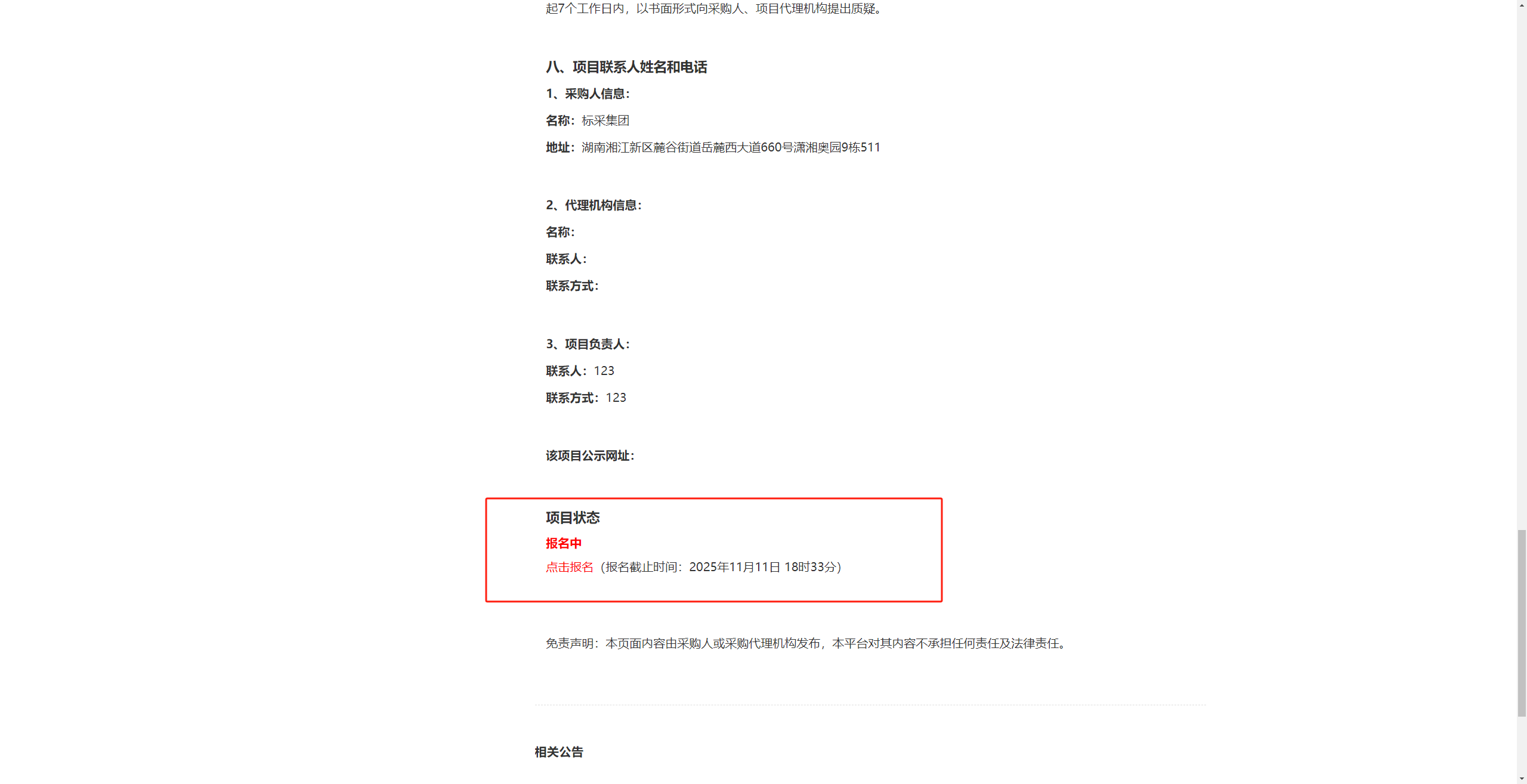 如果采购人发布的是公开项目,则在平台首页的“招标(采购)公告”页中看到有“报名中”的项目,点击查看详情。